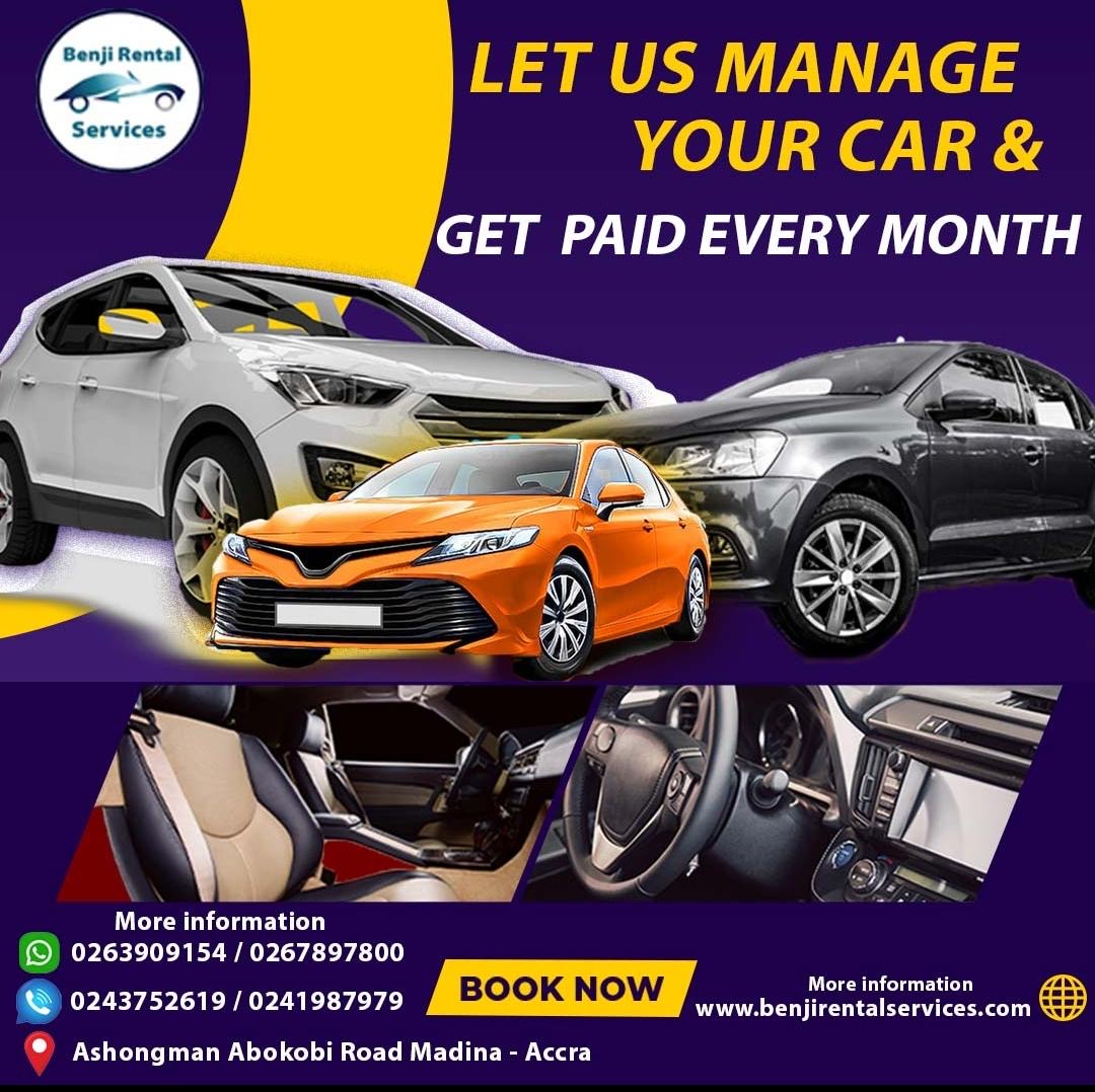 Benji Rental Services invites you to get into an agreement as a vehicle owner prepared to generate revenue from your vehicle, wherein you will receive GHS 2,500 per month. We are responsible for proper maintenance of vehicles to ensure saftey to our customers also.